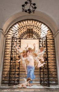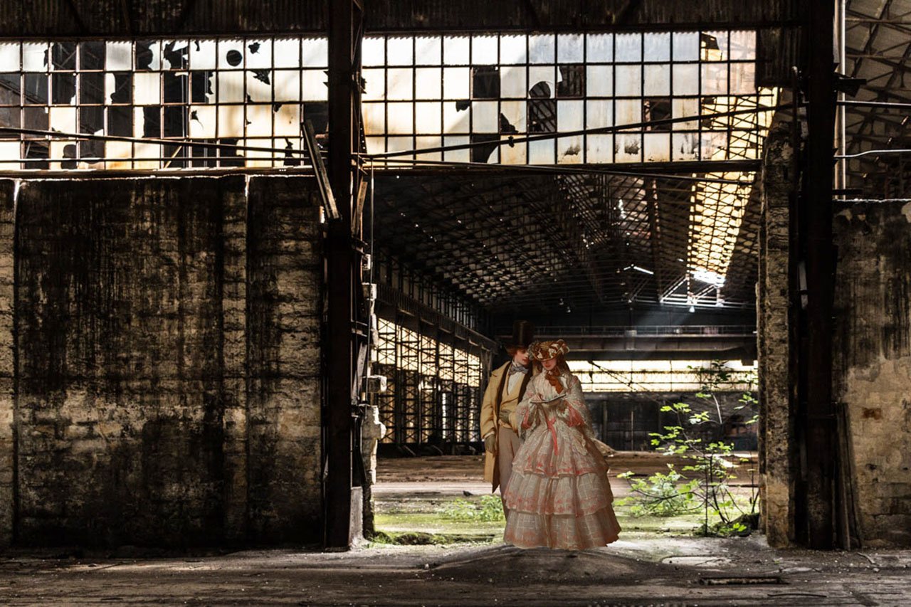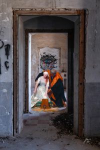 Arte e Fotografia così si incontrano in un percorso creativo, allacciando un rapporto nuovo, come una finestra che si apre dal passato al presente, o viceversa, in un connubio di Arte e tecnologia per raccontare di un’antica umanità che danza, che riposa, che si racconta o che lavora… in una entropia di luoghi dove la furia della devastazione e del tempo che scorre in fretta ha cancellato l’armonia e il colore della vita proponendo una sua lettura nuova dello scorrere tranquillo e lento del tempo. Sono i personaggi dell’Arte pittorica a soffiare quell’alito di vitalità rigenerante sullo sfondo fotografico decadente, proprio come la mamma e la bimba che comunicano sull’uscio di un casolare sporco e dismesso; oppure il cielo stellato di Van Gogh, che illumina lo squallido interno di un laboratorio industriale; o ancora il cavaliere e la dama che leggono poesie e rinnovano il loro tacito patto d’amore e di tenerezza, sulla soglia di un deposito diroccato ed invaso dalle erbacce…